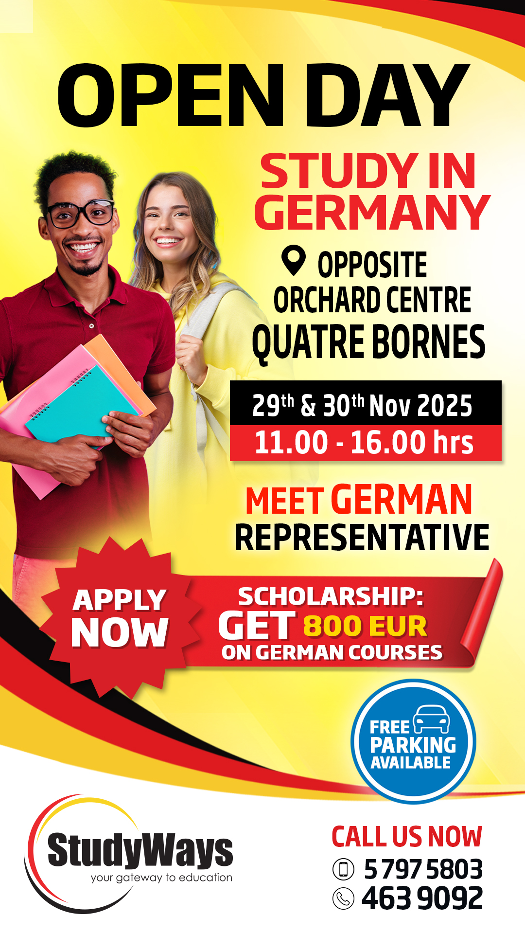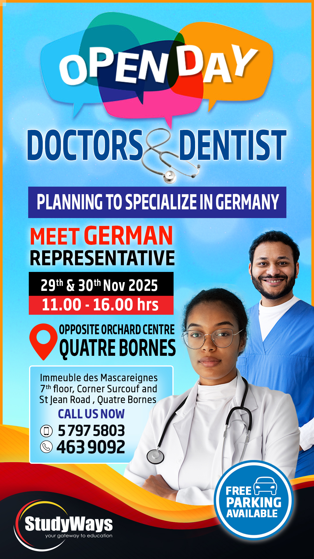Join the Open Day on 29th and 30th November 25 @StudyWays office in Quatre Bornes. Benefit from free one-to-one counselling and get full information on German public and private universities ‼️